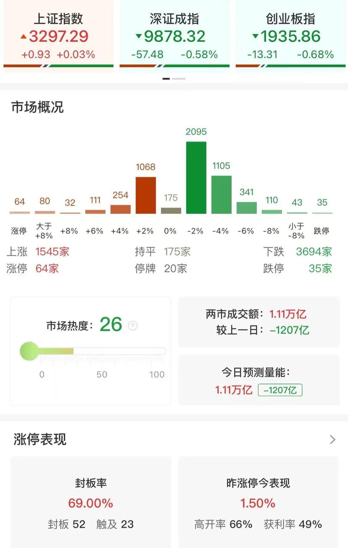 查查配财经报道4月24日,市场全天震荡分化,三大指数涨跌不一。多只高位股尾盘走出反包走势,安记食品、国芳集团均上演“地天板”。沪深两市全天成交额1.11万亿,较上个交易日缩量1207亿。
